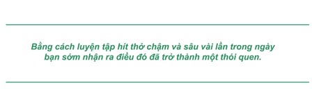 Khi bạn cảm thấy lo lắng, hơi thở của bạn sẽ trở nên gấp gáp và ngắn hơn. Dành ra vài phút trong ngày để dừng lại và tập trung vào hơi thở của mình. Hãy tập hít vào thật chậm và sâu – thở bằng mũi - thở ra thật chậm.