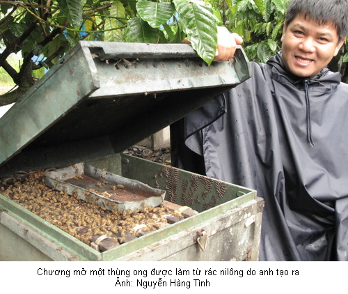 Xưởng đóng thùng ong kiểu mới duy nhất ở VN của Đặng Ngọc Chương nằm sâu trong một vườn trà tại phường ngoại vi Lộc Tiến của thị xã Bảo Lộc, chỗ nào cũng đầy nilông phế thải. Rác nilông sau khi được rửa sạch, phơi khô sẽ xay nát, nấu chảy rồi trộn với trấu để ép thành miếng và cuối cùng ghép thành những “nhà ong”.