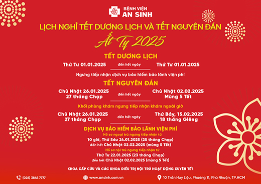 Bệnh viện An Sinh trân trọng gửi tới quý khách lịch hoạt động trong dịp Tết Dương lịch 2025 và Tết Nguyên đán Ất Tỵ 2025. Kính chúc quý khách và gia đình một năm mới sức khỏe, hạnh phúc, thuận lợi và thành công.