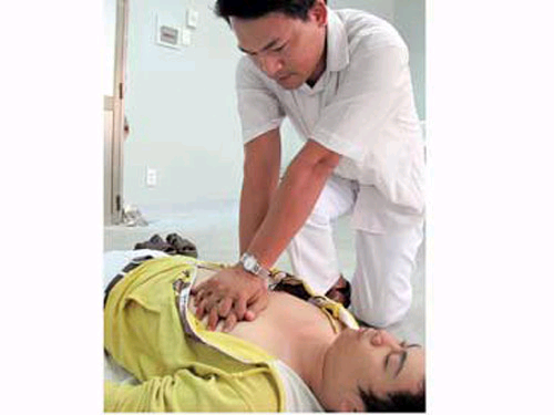 Khi có người ngưng tim, cần nhanh chóng gọi ngay trung tâm cấp cứu gần nhất và sơ cứu bằng cách xoa bóp tim ngoài lồng ngực, đồng thời hà hơi thổi ngạt cho bệnh nhân, cách thực hiện như sau: Gót bàn tay thuận đặt trên xương ức bệnh nhân, bàn tay còn lại đặt lên trên tay thuận. Tần số nhấn khoảng 100 lần/phút. Biên độ nhấn khoảng 4-5cm đối với người lớn và xen kẽ 30 lần nhấn ngực - là hai lần hô hấp nhân tạo.