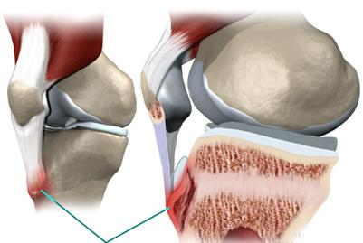 Ở độ tuổi thiếu niên, cơ thể đang phát triển, xương của trẻ mới được hình thành từ sụn tiếp hợp nằm ở đầu xương. Khi cùng chịu một lực tác dụng, xương không tổn thương, còn sụn không chắc khỏe như xương nên bị sưng và đau nhức. Tình trạng đau đầu gối kiểu này là hậu quả của các chấn thương liên tục do vận động, tác động lên đầu trên của xương chày tại vị trí gắn kết của gân xương bánh chè. Những hoạt động của trẻ như chạy nhảy, gập gối nhiều khi tập luyện các môn điền kinh, bóng đá, bóng chuyền, thể dục dụng cụ… làm cho cơ tứ đầu đùi co kéo nhiều, tác động lên gân xương bánh chè. Khi gân xương bánh chè bị kéo rút, thậm chí bị bóc tách khỏi vùng nó bám dính ở lồi củ xương chày dẫn đến sưng đau.