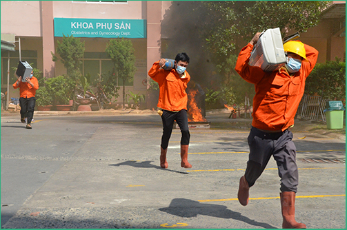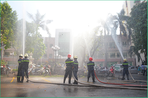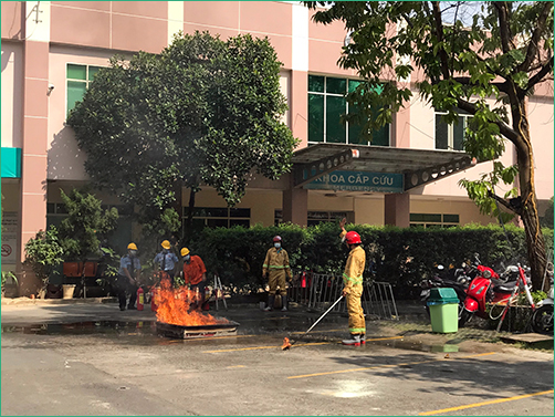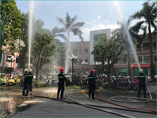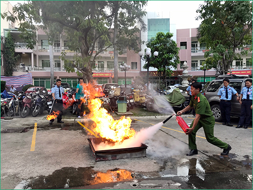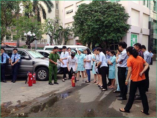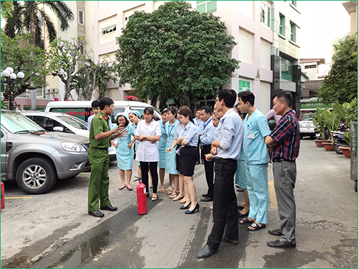 Sau phần phổ biến lý thuyết, Phòng Cảnh sát PCCC Quận Bình Thạnh cùng toàn thể cán bộ và nhân viên Bệnh viện An Sinh đã thực hành cách sử dụng các phương tiện bình bột, bình CO2 để dập tắt đám cháy và cách thức xử lý nhanh các tình huống có thể xảy ra.