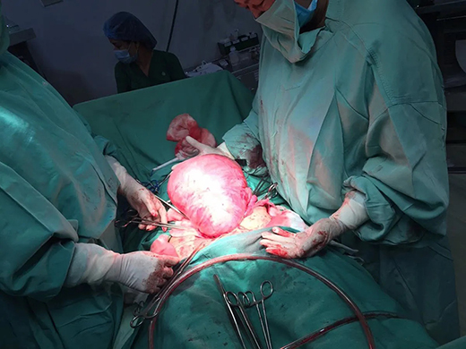 BS Huỳnh Thị Trong, Trưởng khoa Phụ sản trực tiếp khám và phát hiện đây là khối u xơ tử cung đã phát triển lớn, cần phẫu thuật để tránh các biến chứng. Trong quá trình phẫu thuật, do khối u rất lớn có kích thước khoảng 28x25cm nên các bác sĩ đã quyết định cắt hoàn toàn tử cung và hai phần phụ.