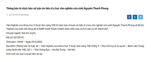 Ngày 25/4/2022, Bác sĩ CKII Nguyễn Thanh Phong đã bảo vệ thành công luận án Tiến sĩ tại Viện Nghiên cứu Khoa học Y Dược lâm sàng 108 với đề tài nghiên cứu là “Nghiên cứu biến đổi nồng độ H-FABP huyết thanh ở bệnh nhân nhồi máu cơ tim cấp có ST chênh lên”.