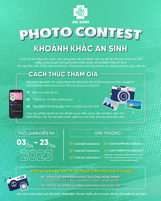 Để tham gia cuộc thi, anh chị đăng ảnh dự thi lên facebook cá nhân của anh chị với hashtag #benhvienansinh #khoanhkhacansinh2023 và gửi đường dẫn đăng ảnh dự thi tới email mkt@ansinh.com.vn hoặc tin nhắn Fanpage An Sinh.