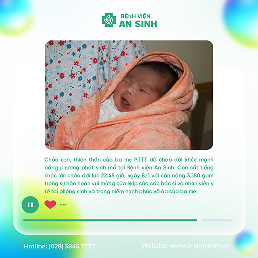 Chào con, thiên thần của ba mẹ PTTT đã chào đời khỏe mạnh bằng phương pháp sinh mổ tại Bệnh viện An Sinh. Con cất tiếng khóc lớn chào đời lúc 22:45 giờ, ngày 8/1với cân nặng 3.350 gam trong sự hân hoan vui mừng của êkíp của các bác sĩ và nhân viên y tế tại phòng sinh và trong niềm hạnh phúc vỡ òa của ba mẹ.