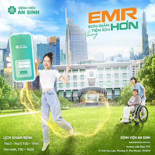Bệnh viện An Sinh đã triển khai Bệnh án điện tử ngoại trú (EMR) là một trong những nỗ lực nâng tầm chất lượng dịch vụ và phục vụ, mang đến trải nghiệm tiện ích công nghệ khi đi khám bệnh với ưu điểm giúp bạn chủ động quản lý hồ sơ thông tin sức khỏe, tiết kiệm thời gian và chi phí khám chữa bệnh.