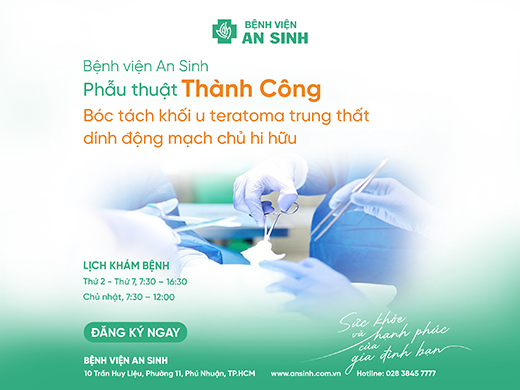 Ngày 17/2/2025, Bệnh viện An Sinh tiếp nhận bệnh nhân nữ, sinh năm 1991, được bác sĩ chẩn đoán có khối u teratoma trung thất trước lệch phải, kích thước 7x7cm, dính vào tĩnh mạch chủ trên và màng ngoài tim. Bệnh nhân được bác sĩ chỉ định phẫu thuật nội soi lồng ngực để bóc tách khối u