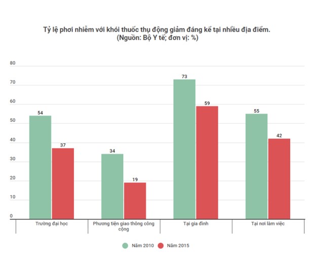 Thứ trưởng Tiến cho hay, theo báo cáo điều tra tình hình sử dụng thuốc lá ở người trưởng thành (năm 2015) công bố mới nhất cho thấy, tỷ lệ phơi nhiễm với khói thuốc thụ động giảm đáng kể so với năm 2010 ở hầu hết các địa điểm. Giảm mạnh nhất là tại trường đại học với mức giảm từ 54% xuống 37%, trên các phương tiện giao thông công cộng giảm từ 34% xuống 19%, tại gia đình giảm từ 73% xuống 59%, tại nơi làm việc giảm từ 55% xuống còn 42%.