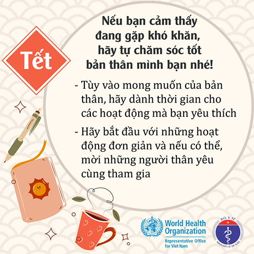 Bộ Y tế và Văn phòng WHO tại Việt Nam đưa lời khuyên: “Nếu bạn cảm thấy đang gặp khó khăn, hãy tự chăm sóc tốt bản thân mình bạn nhé! Tùy vào mong muốn của bản thân, hãy dành thời gian cho hoạt động mà bạn yêu thích. Hãy bắt đầu với những hoạt động đơn giản và nếu có thể, mời những người thân yêu cùng tham gia.”