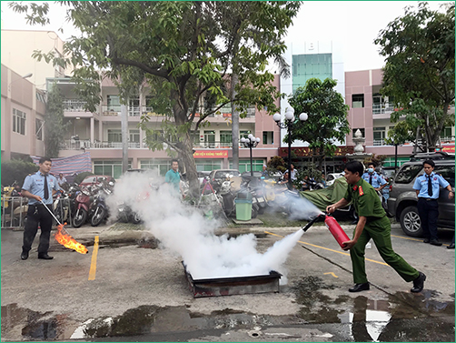 Sau phần phổ biến lý thuyết, Phòng Cảnh sát PCCC Quận Bình Thạnh cùng toàn thể cán bộ và nhân viên Bệnh viện An Sinh đã thực hành cách sử dụng các phương tiện bình bột, bình CO2 để dập tắt đám cháy và cách thức xử lý nhanh các tình huống có thể xảy ra.
