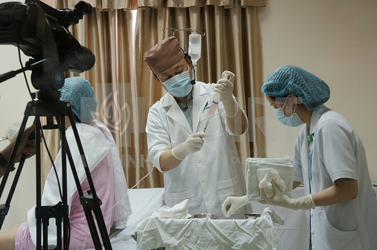 Trong buổi hội thảo, Bác sĩ Kasey Kisu Sung đã trình diễn kỹ thuật tiêm tế bào gốc phân lập từ mô mỡ tự thân trực tiếp trên người bệnh để điều trị thoái hóa khớp gối và trẻ hóa da mặt, cũng phục hồi các cơ quan tổn thương bên trong cơ thể.