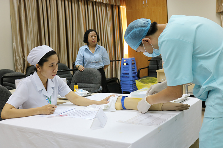 Trong phần thi thực hành năm nay, Điều dưỡng - Hộ sinh phải thể hiện được sự chuyên nghiệp, nắm vững kiến thức chuyên môn và trải qua 5 bài thi gồm: (1) Tiêm tĩnh mạch; (2) Tiêm bắp; (3) Đo huyết áp; (4) Thông tiểu; (5) Thay băng cắt chỉ trên mô hình. Đồng thời, Điều dưỡng - Hộ sinh phải đưa ra phương án xử lý thuyết phục nhằm đáp ứng những yêu cầu khắt khe của người bệnh mà vẫn đảm bảo độ chính xác và thời gian đúng quy định.