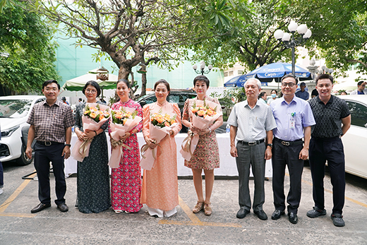 Tiến sĩ Bác sĩ Mai Văn Điển đại diện cho phái mạnh gửi lời chúc mừng và tặng hoa cho các nữ giám khảo hội thi nấu ăn mừng ngày Quốc tế Phụ nữ 8.3
