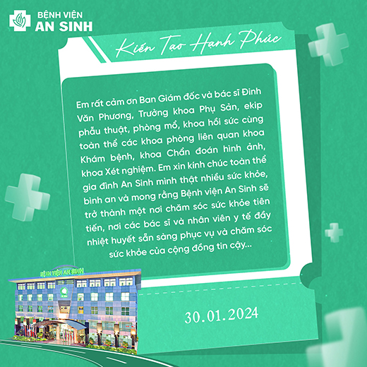 Em rất cảm ơn Ban Giám đốc và bác sĩ Đinh Văn Phương cùng toàn thể các khoa phòng liên quan rất rất nhiều. Em xin kính chúc toàn thể gia đình An Sinh mình thật nhiều sức khỏe, bình an và mong rằng Bệnh viện An Sinh sẽ trở thành một nơi chăm sóc sức khỏe tiên tiến, nơi các bác sĩ và nhân viên y tế đầy nhiệt huyết sẵn sàng phục vụ và chăm sóc sức khỏe của cộng đồng tin cậy.”