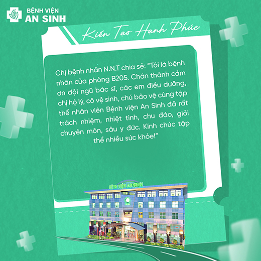 Chị N.N.T chia sẻ: “Tôi là bệnh nhân của phòng B205. Chân thành cảm ơn đội ngũ bác sĩ, các em điều dưỡng, chị hộ lý, cô vệ sinh, chú bảo vệ cùng tập thể nhân viên Bệnh viện An Sinh đã rất trách nhiệm, nhiệt tình, chu đáo, giỏi chuyên môn, sâu y đức. Kính chúc tập thể nhiều sức khỏe!”