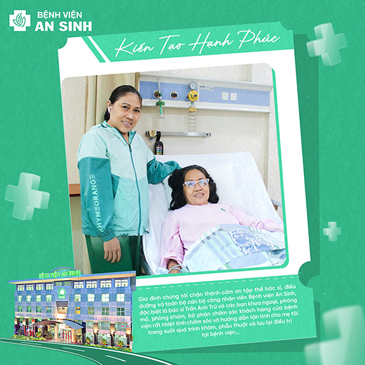 “Gia đình chúng tôi chân thành cảm ơn tập thể bác sĩ, điều dưỡng và toàn bộ cán bộ công nhân viên Bệnh viện An Sinh, đặc biệt là bác sĩ Trần Anh Trứ và các bạn khoa ngoại, phòng mổ, bộ phận chăm sóc khách hàng của bệnh viện đã tận tình giúp đỡ, chăm sóc và điều trị cho mẹ tôi là bệnh nhân T.T.N.D trong quá trình khám và phẫu thuật tại bệnh viện. Các bạn từ phòng khám, chăm sóc khách hàng đến bác sĩ và tập thể khoa Ngoại rất nhiệt tình chăm sóc và hướng dẫn tận tình cho mẹ tôi trong suốt quá trình lưu lại điều trị tại quý bệnh viện.