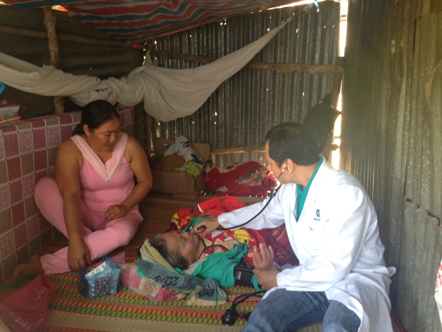Bác sĩ đến khám và phát thuốc tại nhà cho những người dân bệnh nặng không thể đến được với đoàn.